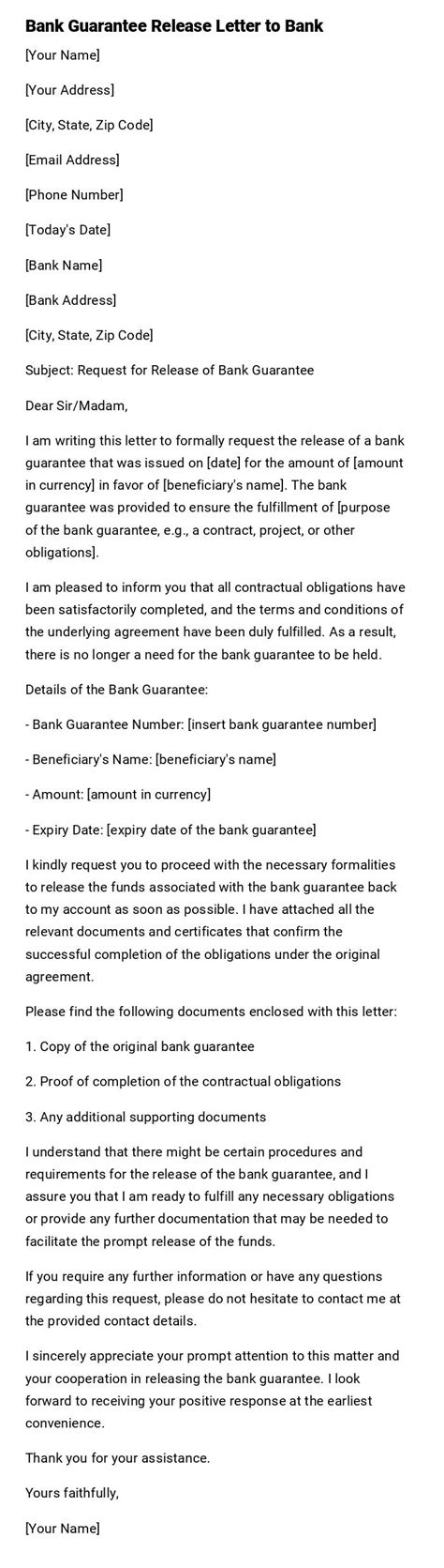 - Opening Paragraph: Briefly state your purpose – that you are requesting the release of the bank guarantee.