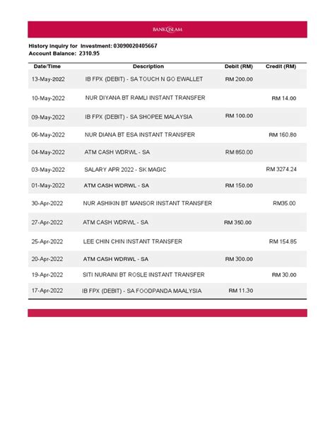 The heart of your Bank Islam statement lies in the transaction details . This section lists all the transactions that occurred during the statement period. Each transaction is typically listed with the date, description, and amount. The description provides information about the nature of the transaction, such as a deposit, withdrawal, payment, or fee. The amount indicates the value of the transaction, with credits (deposits) shown as positive amounts and debits (withdrawals) shown as negative amounts.