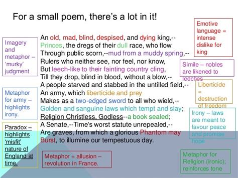 Let’s break down the poem a bit. The first eight lines (the octave, if we’re thinking in Petrarchan terms) paint a pretty grim picture. We’ve got a “An old, mad, blind, despised, and dying king” , useless princes, and a corrupt Church. Shelley doesn’t hold back! These lines are filled with strong, negative imagery designed to evoke a sense of disgust and outrage. He’s setting the stage to show just how messed up England is at this point in time. The next six lines (the sestet) continue this theme, highlighting the suffering of the people and the injustice of the laws. But then, BAM! The final couplet hits us with a glimmer of hope: “A golden and sanguine Sunrise with splendour to come, and shakes the nations” . That final couplet offers a contrasting image of potential renewal and revolution, suggesting that from this decay, something new and powerful will emerge.