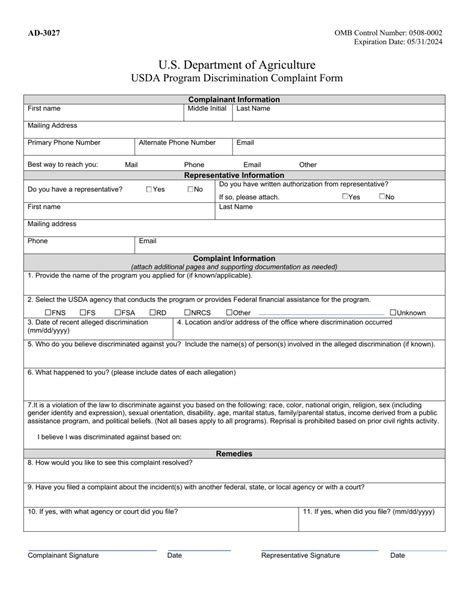 The AD-3027 form itself is pretty straightforward. It gathers all the necessary information about your complaint. You’ll be asked to provide details about the alleged discrimination, including the specific program or activity involved, the date(s) of the incident(s), and the basis for the discrimination (like race, color, national origin, etc.). You’ll also need to provide your contact information and any supporting documentation that might help your case. It’s designed to be a comprehensive record of your complaint, ensuring that the USDA has all the necessary information to conduct a thorough investigation. It’s not just a formality; it’s the backbone of the entire complaint process, and accurately filling it out is super important.