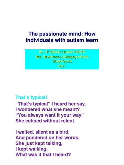 I Wendy Lawson has made significant contributions to our understanding of autism, particularly in the areas of sensory processing, communication, and the importance of understanding the autistic perspective from the inside out. Her work challenges conventional wisdom and encourages a more nuanced and respectful approach to autism. She emphasizes that autism is not a deficit but a difference, and her advocacy promotes acceptance and inclusion of autistic individuals in all aspects of society. Her insights into sensory processing have been particularly influential. Lawson describes the experience of sensory overload, where everyday stimuli become overwhelming and distressing. She explains how this can lead to anxiety, meltdowns, and difficulties with social interaction. Her work has helped to raise awareness of the sensory sensitivities experienced by many autistic individuals and has informed the development of sensory-friendly environments. In the realm of communication, Lawson highlights the differences in communication styles between autistic and neurotypical individuals. She emphasizes the importance of direct and unambiguous communication and cautions against relying on nonverbal cues that may be misinterpreted. Her insights have helped to improve communication between autistic individuals and their families, educators, and healthcare providers. Furthermore, Lawson’s emphasis on understanding the autistic perspective from the inside out has been invaluable. By sharing her own experiences and insights, she helps others to see the world through the eyes of an autistic person. This fosters empathy and understanding and challenges stereotypes and misconceptions. Her work has been instrumental in promoting a more inclusive and accepting society for autistic individuals.
