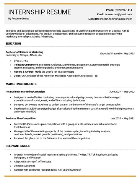 This is where you showcase your hard and soft skills. Hard skills are technical abilities like coding languages, software proficiency, or data analysis. Soft skills are interpersonal abilities like communication, teamwork, and problem-solving. Tailor your skills list to match the requirements of the specific internship you’re applying for. For example, if the internship requires proficiency in Python, make sure to include it in your skills list. Use bullet points to make your skills easy to read. Also, consider categorizing your skills to make them even more organized. For example, you could have categories like “Programming Languages,” “Software Proficiency,” and “Communication Skills.” This will help employers quickly identify the skills that are most relevant to the internship. Don’t just list your skills; provide examples of how you’ve used them in the past.