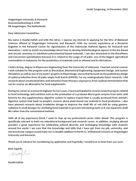 Statement of Purpose : A compelling statement of purpose is crucial for showcasing your passion for environmental science and your motivation for pursuing the MSc program at Wageningen. In your statement, highlight your relevant experiences, your research interests, and your career goals. Explain why you are interested in Wageningen University and how the program will help you achieve your aspirations. Your statement should be well-written, concise, and demonstrate your understanding of the environmental challenges facing the world today.
