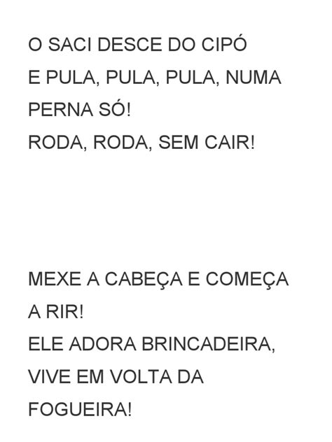 *“No terreiro, veloz e fugaz, O Saci apronta, ninguém o desfaz. Com seu gorro vermelho, ele é sagaz, E some na mata, ligeiro e voraz. Pra pegá-lo, é preciso ter paciência, Ou talvez um feitiço de grande ciência.”