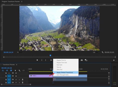 2. Apply Default Transition : Right-click on the cut point and select Apply Default Transitions . Premiere Pro will automatically add the default video and audio transitions (if applicable) to that point.