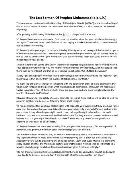 So, what exactly did the Prophet say in this monumental sermon? The Farewell Sermon was packed with wisdom, covering a wide array of ethical and social issues. One of the most crucial points emphasized was the sanctity of life and property . The Prophet declared, “ Your blood and your property are sacred to each other until you meet your Lord .” This was a powerful statement against violence, injustice, and theft, setting a clear moral boundary. He reinforced the idea that everyone is accountable for their actions. Another vital theme was equality and brotherhood . He adamantly stated, “ All mankind is from Adam and Eve, an Arab has no superiority over a non-Arab nor a non-Arab has any superiority over an Arab; also a white has no superiority over a black nor a black has any superiority over a white except by piety and good action .” This was a revolutionary concept in a society often divided by tribalism and racial prejudice. The last message of Prophet Muhammad strongly advocated for a society based on faith and good deeds, not on lineage or color. He also stressed the importance of family and women’s rights . He urged men to treat their wives kindly and with respect, acknowledging their rights and responsibilities. This was particularly significant given the social norms of the time. Furthermore, the sermon highlighted financial responsibility and the prohibition of usury (riba) . He declared the abolition of all interest, starting with that of his own uncle, Abbas ibn Abd al-Muttalib. This underscored the Islamic emphasis on economic justice and fairness. The Prophet also urged his followers to hold firmly to the Quran and his Sunnah (teachings and practices) . He said, “ I have left among you that which, if you hold fast to it, will never go astray: the Book of Allah and my Sunnah .” This dual reliance on the divine scripture and the Prophet’s example is the bedrock of Islamic practice. The Farewell Sermon is a masterclass in ethical living, providing a comprehensive framework for individual and collective conduct. It’s a message that resonates with universal values of justice, compassion, and accountability, making it eternally relevant.