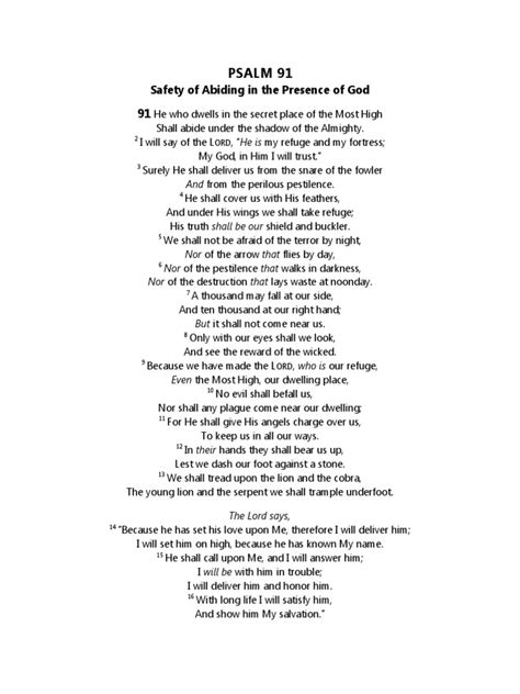 So, what’s the big deal about Psalm 91 ? This chapter is renowned for its promises of divine protection and refuge. It paints a vivid picture of God as a mighty fortress, a safe haven for those who trust in Him. The imagery is incredible: “He will cover you with his feathers, and under his wings you will find refuge; his faithfulness will be your shield and rampart.” (Psalm 91:4). How awesome is that? It speaks to a profound sense of security, assuring believers that even in the face of danger, pestilence, or any kind of trouble, divine help is always near. This isn’t just abstract theology; it’s a practical guide for living with confidence and courage. The psalm reassures us that no harm will come near our dwelling if we make the Most High our dwelling place. This promise has been a source of immense comfort for centuries, offering a spiritual anchor in turbulent times. The language used is strong and protective, using metaphors like shields, ramparts, and eagles’ wings to convey a sense of impenetrable defense. It assures us that we don’t have to face our fears alone; there is a higher power watching over us. This message is particularly potent in today’s world, where uncertainties can often feel overwhelming. The commitment of God, as described in Psalm 91, is unwavering. It’s a promise of constant companionship and protection, regardless of the circumstances. This deep-seated belief fosters a sense of peace that transcends worldly worries, allowing individuals to live with a greater sense of hope and resilience. The psalm doesn’t promise a life free from trials, but it guarantees presence and protection through them. This is a crucial distinction that offers realistic hope and profound strength to those who hold onto its message. The divine assurance provided by Psalm 91 is not dependent on our own strength but on the faithfulness of God. This reliance on a higher power empowers individuals to face challenges with a spirit of faith rather than fear, knowing they are never truly alone. The consistent theme of refuge and safety makes it a go-to scripture for anyone seeking comfort and assurance in difficult situations. The vivid metaphors and direct promises make the message accessible and deeply personal, fostering a powerful connection between the believer and the divine protector.