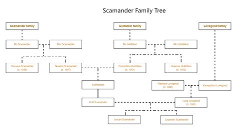 While the direct line of the Scamander family tree primarily focuses on Newt, Tina, and Rolf, it’s always fun to speculate about other possible relatives and connections. Given the nature of wizarding families and the potential for distant relations, there could be other Scamanders scattered throughout the wizarding world. Perhaps there are Scamanders working in different branches of the Ministry of Magic, contributing to magical research, or even pursuing other fascinating careers. It’s also worth considering the potential connections between the Scamander family and other well-known wizarding families. Marriage, alliances, and shared interests could have created ties that extend beyond the immediate family tree. For example, are there any connections to families known for their expertise in Herbology, given Newt’s deep understanding of magical plants? Or perhaps there are links to families with a history of exploration and adventure, reflecting the Scamander’s own adventurous spirit? While these connections may be speculative, they add depth and intrigue to the Scamander family history. They remind us that the wizarding world is a complex and interconnected place, where families and individuals are constantly shaping and influencing each other. Who knows, maybe one day J.K. Rowling will reveal even more about the Scamander family tree, unveiling new relatives, connections, and stories that further enrich the magical world. Until then, we can continue to speculate, imagine, and appreciate the remarkable legacy of the Scamander family and their contributions to the wizarding world.