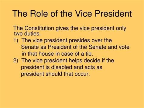 So, when the Founding Fathers were putting together the U.S. Constitution, they had to figure out who would be next in line if something happened to the President. That’s where the role of the Vice President was born, primarily as a successor. Article II, Section 1 of the Constitution clearly states that the Vice President “shall hold the Office of President,” should the President die, resign, or be removed from office. This is arguably the most critical function of the Vice President, providing a line of succession that ensures stability in leadership. But they didn’t just stop there! The Constitution also assigns the Vice President the role of presiding over the Senate. This is a pretty interesting gig because it gives them the power to cast a tie-breaking vote when the Senate is evenly divided. Think about how many crucial pieces of legislation have come down to a single vote – yeah, the Vice President can be the deciding factor! While this constitutional duty might seem a bit formal and perhaps even ceremonial at times, it’s a direct link to the legislative branch and a reminder that the Vice President isn’t just an executive officer. They have a hand in the lawmaking process. It’s this dual role, executive in succession and legislative in presiding, that sets the stage for the more varied duties the office has taken on throughout history. The framers were pretty clever, laying a groundwork that allowed for the role to adapt and grow in importance without needing constant constitutional amendments. It’s a testament to their foresight that this office, initially conceived as a backup, has become such a vital part of the American governmental system, influencing policy and representing the nation on a global scale. The early days saw Vice Presidents with less defined roles, often relegated to presiding over the Senate and little else. However, as the nation grew and faced complex challenges, the office started to gain more influence, particularly through the President’s delegation of responsibilities. This gradual expansion of duties reflects the dynamic nature of American governance and the increasing complexity of the executive branch. The Vice President’s office is no longer just about succession; it’s about active participation and leadership within the administration.